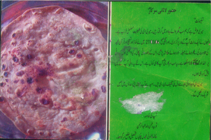 Sobia Rehman from Chakiyan, Sargodha states: My whole family was affected by the black magic, my mother health was often bad, Once she went to Astana Alia Lasani Sarkar and received Ruqyah from there she also lived there for few days and her health started to get better day by day. After that my whole family took oath of allegiance from His holiness Sufi Masood Ahmad Siddiqui Lasani Sarkar. Therefore, black magic effects on my family starting to disappear and we all are living a healthy and prosperous life now. One morning after Salat and remembrance of Allah Almighty when I made chapattis for the breakfast suddenly the sacred names of Allah Almighty and Prophet Mohammad (PBUH) appeared on one chapatti obviously this is a spiritual benevolence and verification of the right path and it is happening because of His holiness Sufi Masood Ahmad Siddiqui Lasani Sarkar.